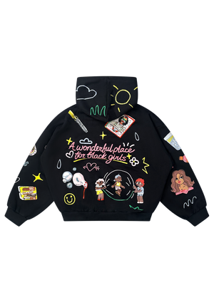 DESCRIPTION šThe "Childhood Hoodie" brings back the good old days ā hot combs, barrettes, double dutch, Kool-Aid, and cartoons all day. A cozy reminder of the best parts of growing up.